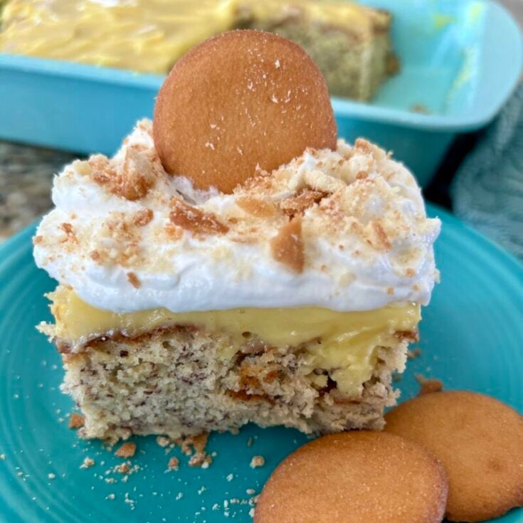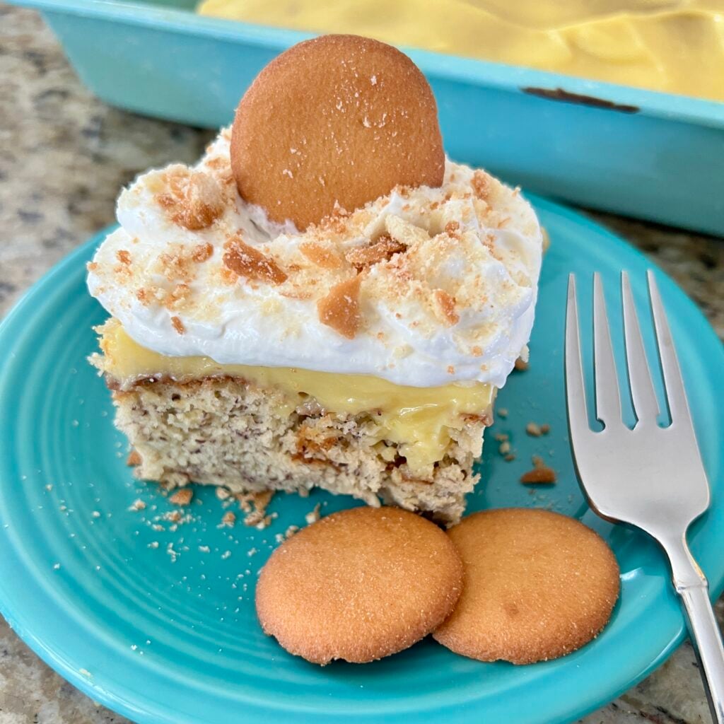 This isn’t just any cake. It’s a luscious banana pudding poke cake made with a yellow cake mix (or your favorite box cake mix) and layered with flavor. The mashed bananas baked right into the batter give it that rich, homemade taste, while the creamy pudding mixture adds a cool, silky texture that soaks into every bite.