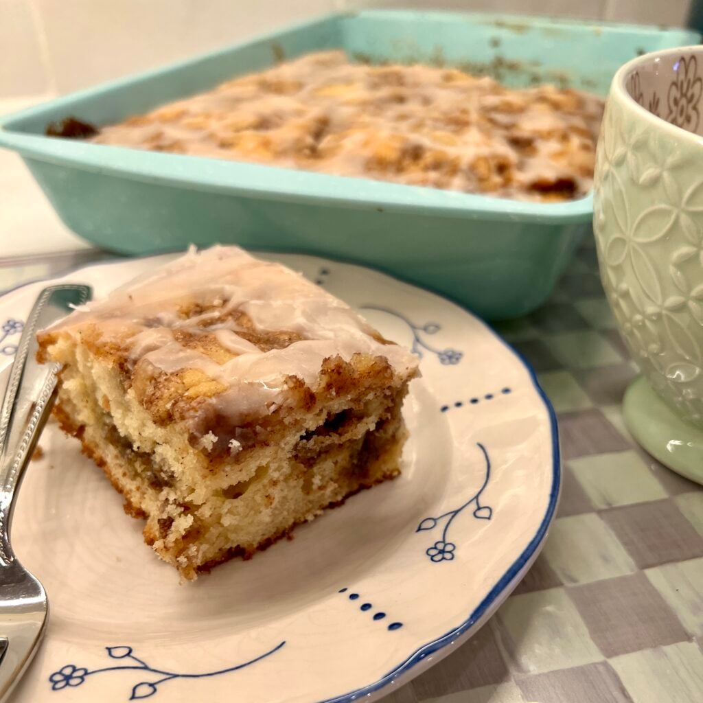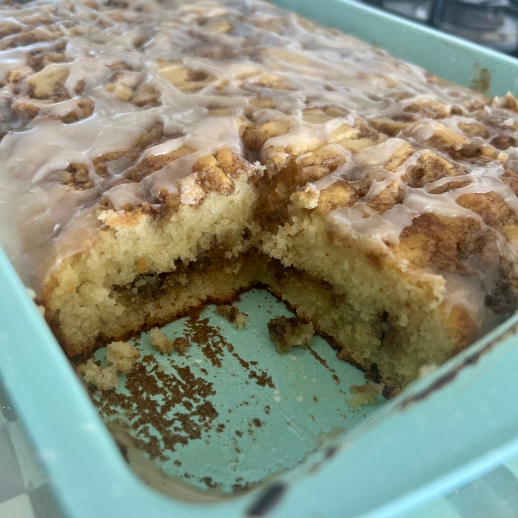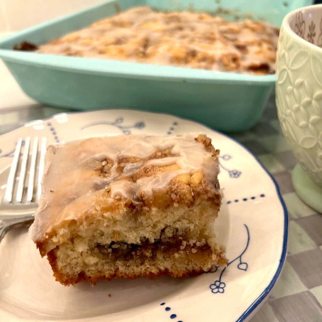 This easy to make cinnamon roll coffee cake has been a go to recipe for as long as I can remember. I mean, who doesn’t love the cinnamon sugar buttery sweet goodness of a cinnamon roll? So why not just bake up those flavors in a cake? Am I right? I thought so!