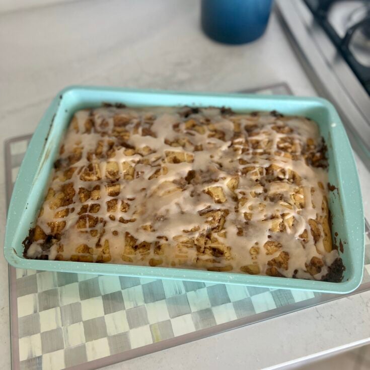 No only is this cinnamon roll cake easy to make, it uses the simplest of ingredients, all of which you likely have in your pantry and refrigerator. That’s one of the reasons why I’ve relied on this recipe for such a long time…I always have the ingredients to make this coffee cake so if I need to whip something up last minute or I’m just in the mood to bake, this cinnamon roll cake fits the bill.