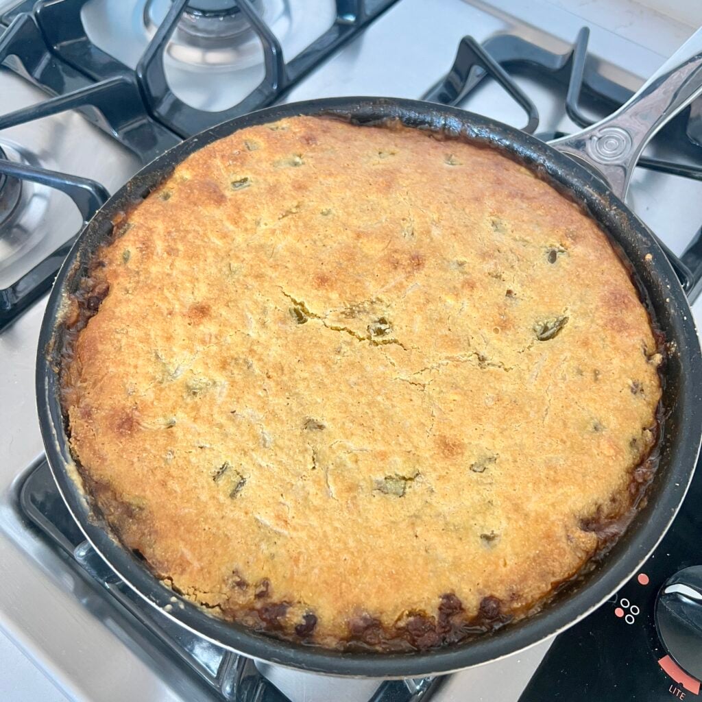 - Spread corn bread batter evenly over meat mixture in skillet.