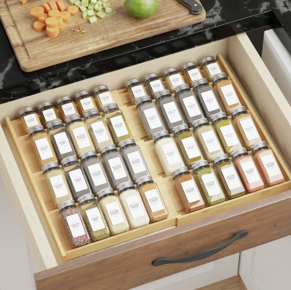 I keep most of my spices in a drawer. It’s the closest thing to my stove and it makes it easy to access my spices in the middle of cooking! If yours are also in a drawer, this bamboo drawer organizer will keep them in one place.