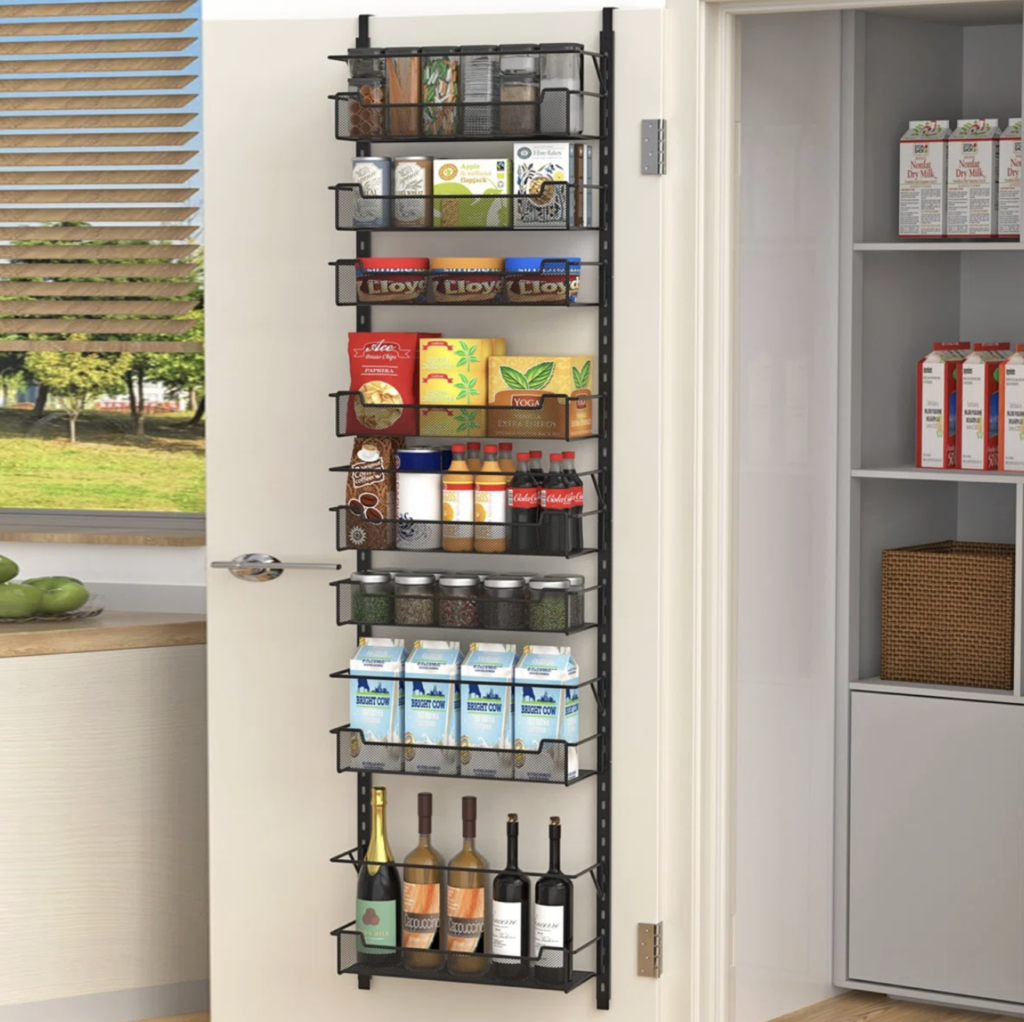 If space is an issue, sometimes going vertical is best! This spice rack from Wayfair has 6 tiers and it can go on the inside of your pantry. Because the tiers are pretty far apart, it can also hold things like olive oil, jars of pasta sauce, and more.
