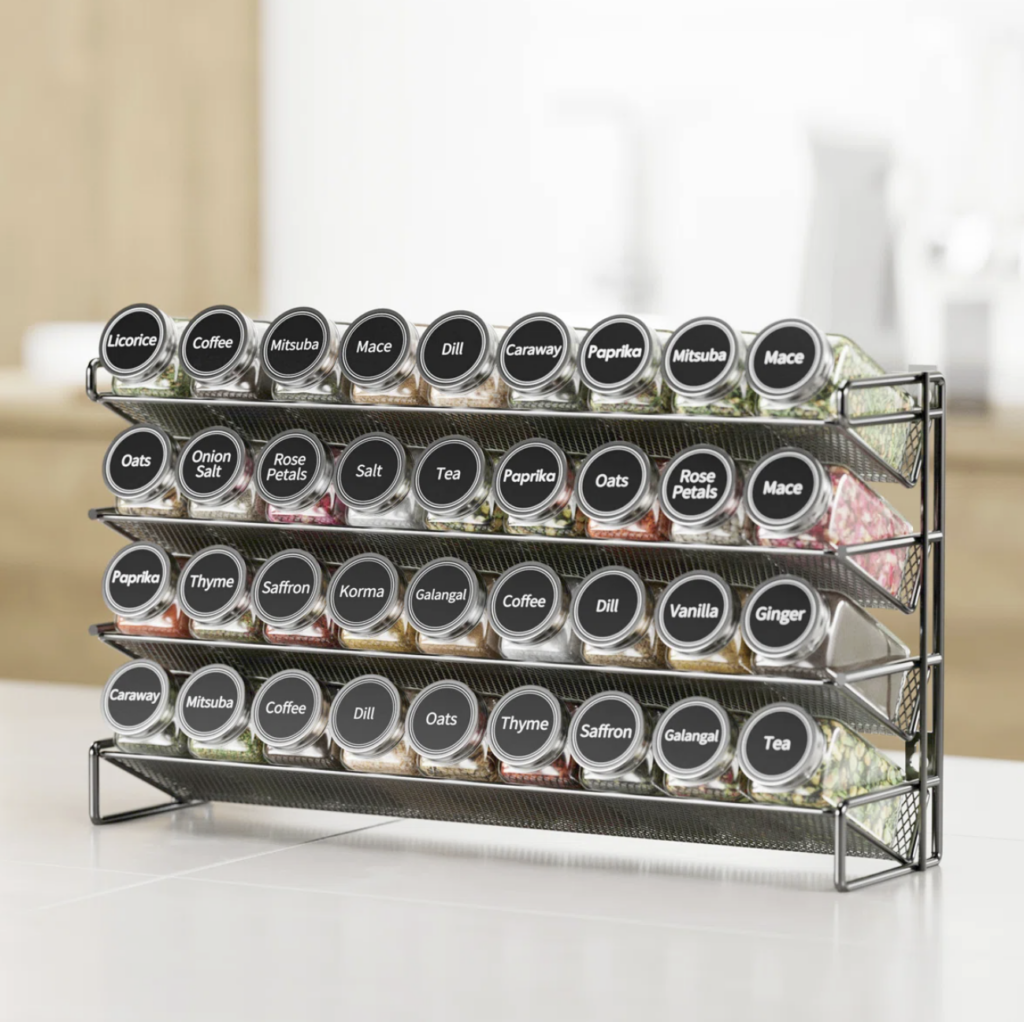 I found this 36-piece clear spice jar set. It also includes chalkboard labels so you don’t add cumin when you mean to add cinnamon 😉
