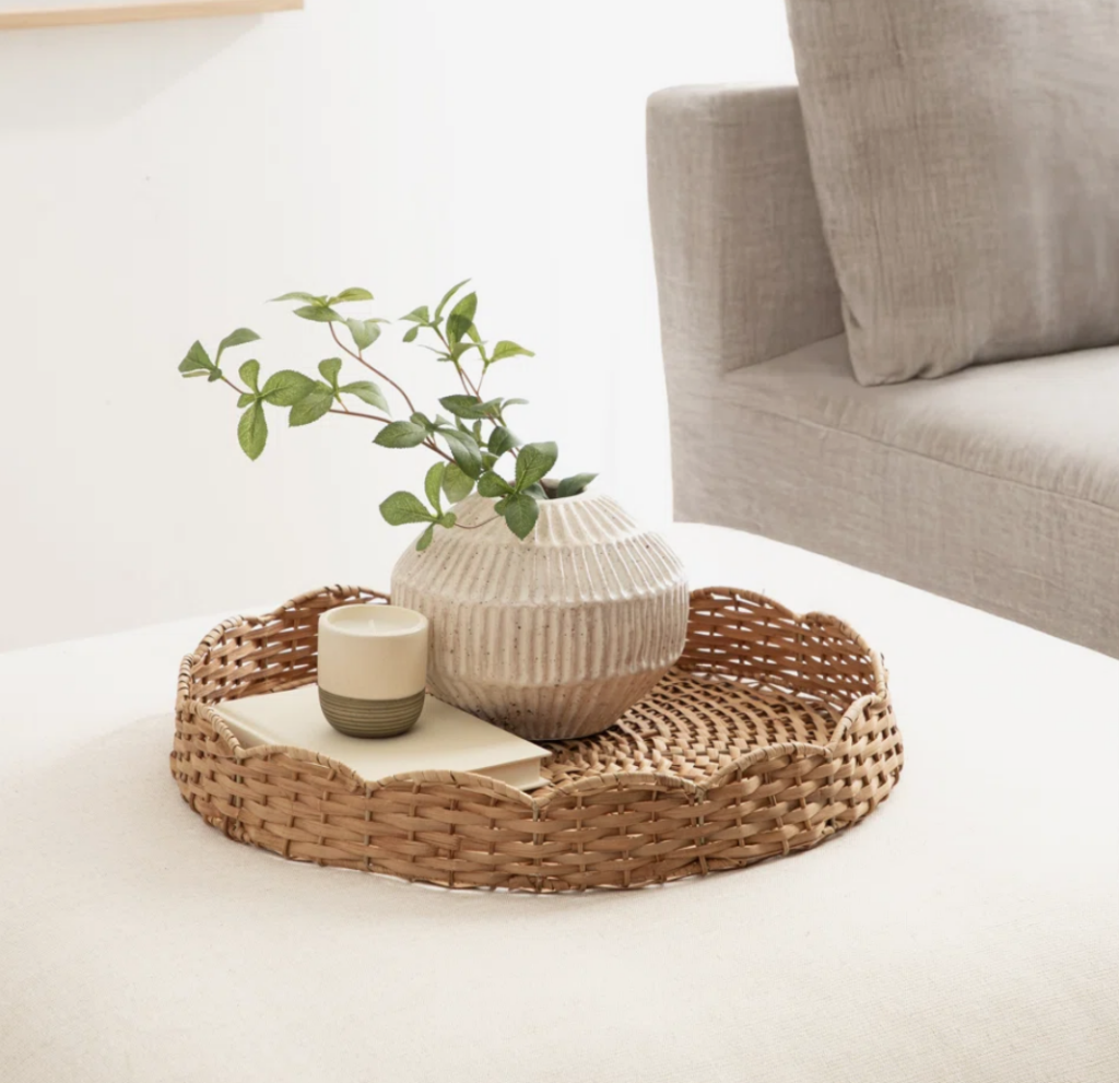 This scalloped round rattan tray is ideal for any coffee table and effortlessly chic. The timeless look will never go out of style, and it’s the perfect catch-all for remotes and other living room items.