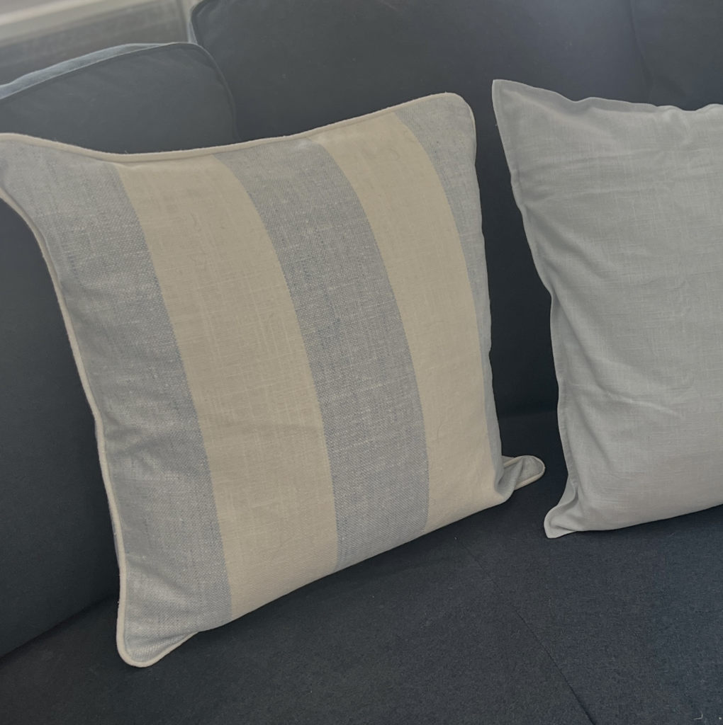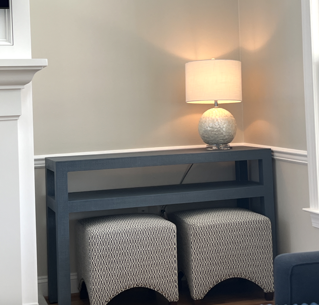 We brought a lot of our furniture from our previous home to our new place. But I didn’t want this house to feel like a copy of what we had before. So I changed up the accent colors I used with our navy couch and leaned into light blues and whites.