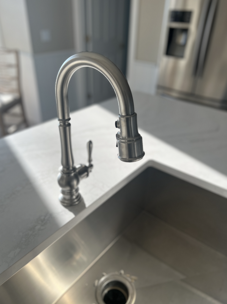 I learned a long time ago that not all kitchen faucets are created equal. It’s one of the most-used items in the kitchen, so quality matters. That’s really how I determine where I spend vs. where I save. I loved the simplicity of this Kohler faucet (ours is the vibrant stainless), the pull-down feature is great, and it doesn’t clutter the countertop, which is also an island with seating.
