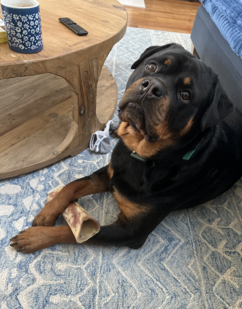 This rug seemed to fit the bill online, and I was thrilled at how it looked in person. Very well made and as you can see… a favorite spot of Kelce already!